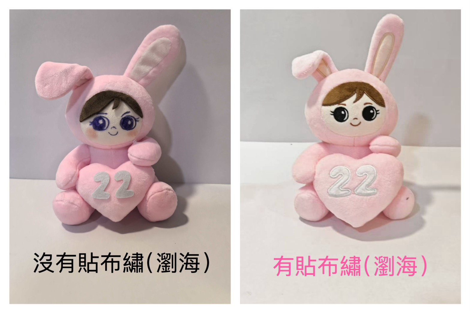 小塊布料裁成圖形縫或黏貼到基底布上,再以車縫或手工繡邊固定(繡邊可裝飾也可加強邊緣),範例如下,請看下圖的(耳朵內襯、瀏海,還有愛心上的22)的差別