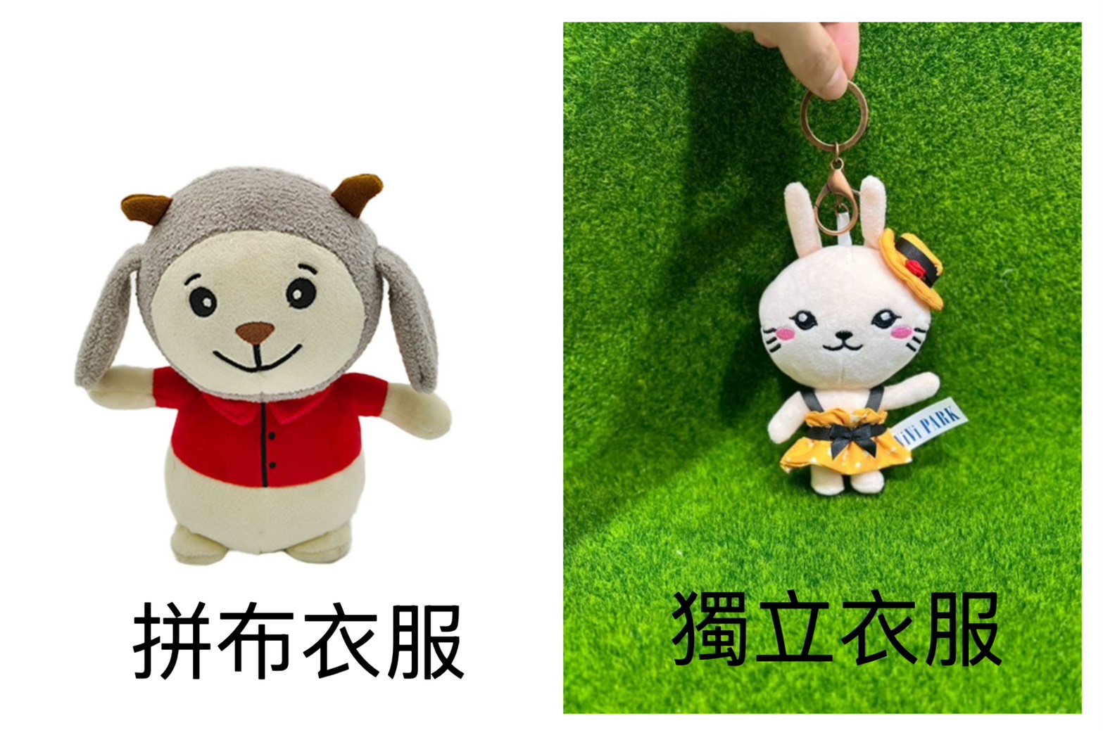 設計衣服的版型,再車縫製作出獨立的衣服,再穿到玩偶身上,製作較為複雜,價格也較貴。